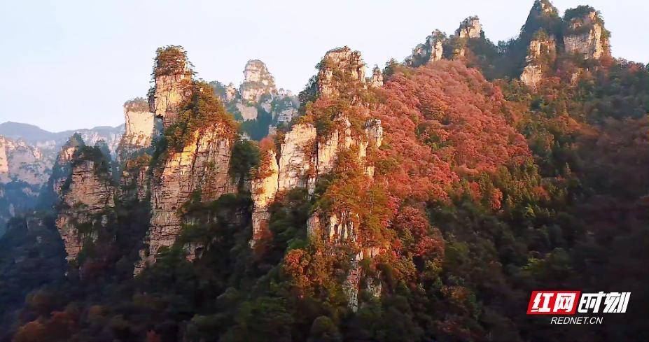 时值深秋,十里画廊的林木褪去盛夏的葱郁,渐次晕染出红、黄、橙等斑斓色彩。峰林与秋林层层叠叠,在晴好天气下呈现出丰富的视觉层次,不少摄影爱好者早早蹲守在此,捕捉峰林在晨雾、晴光中的光影变化,记录属于张家界的秋日限定浪漫。