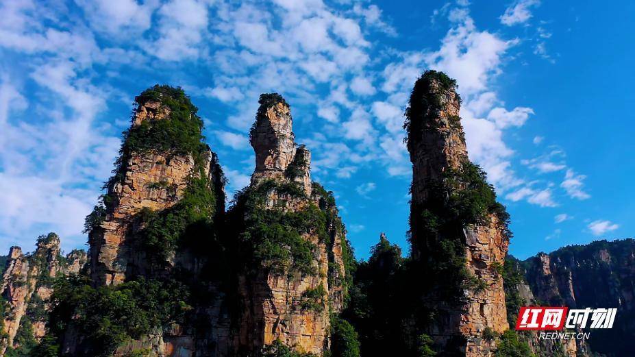 雨后的十里画廊空气澄澈如洗,数百座石英砂岩峰林在阳光照耀下轮廓分明。“向王观书”“三姐妹峰”等标志性石峰景观,在湿润水汽与秋阳的交融中更具神韵,岩层的纹理与植被的翠绿、秋红相映成趣,仿佛大自然以山为纸、以光影为笔,绘就的立体水墨长卷。